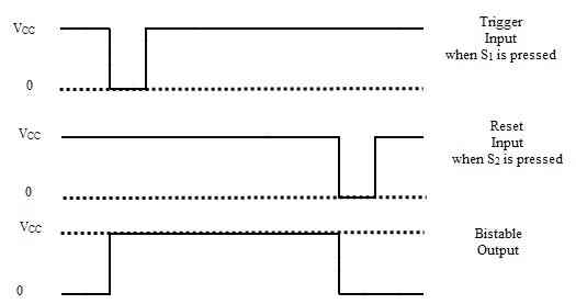 When the switch S2 is pressed, the voltage from VCC will bypass the reset terminal and is shorted to ground through the resistor R2. This pin is internally connected to the RESET terminal of the flip-flop. When this signal goes low for a moment, the flip-flop receives the reset signal and RESETs the flip-flop. Hence, the output will become LOW and stays there until the trigger is applied. The wave forms of the bistable mode of operation of the 555 timer are shown below.