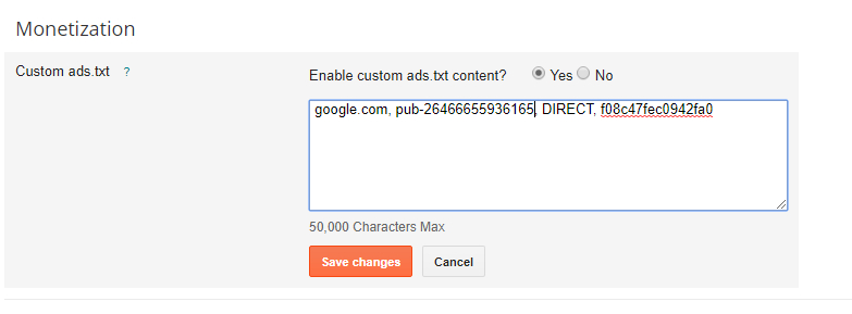 - Enable custom ads.txt content, check Yes
