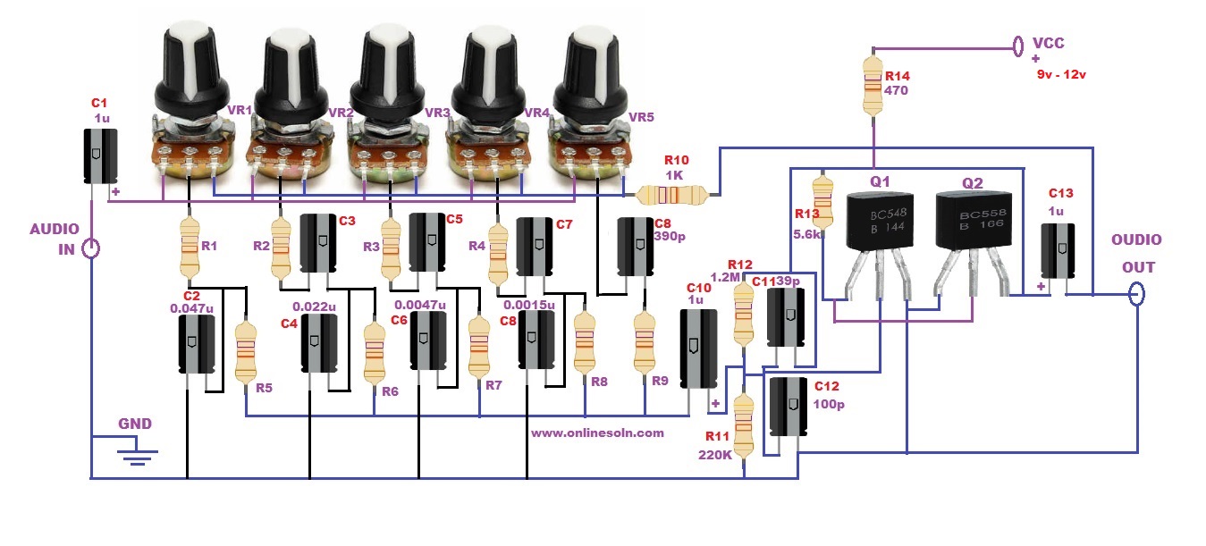 This equalizer circuit can be adjusted the frequency to 5 channel is 60 Hz, 100 Hz, 1 kHz, 3 kHz, and 12 kHz.