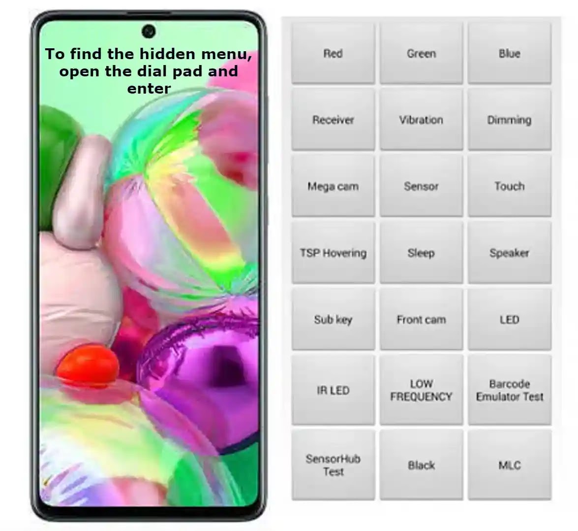 To find the hidden menu, open the dial pad and enter *#0*# with no spaces.