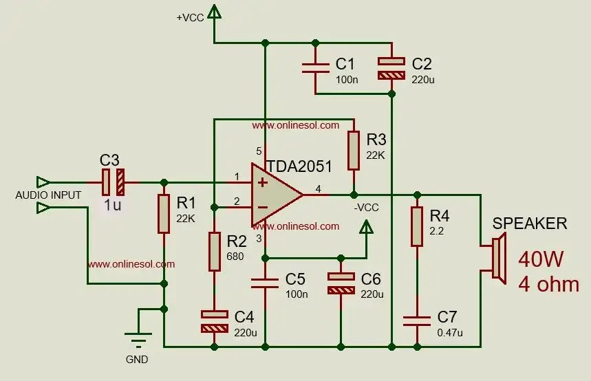 The TDA 2051 is a monolithic integrated circuit in Pentawatt package, intended for use as an audio class AB amplifier. Thanks to its high power capability the TDA2051 is able to provide up to 40W typ. into 4 ohm load @ THD = 10%, VS = ±18V, f = 1KHz and up to 33W into 8ohm load @ THD = 10%, VS = ±22V, f = 1KHz. Moreover, the TDA 2051 delivers typically 60W music power into 4 ohm load over 1 sec at VS= 22.5V, f = 1KHz.