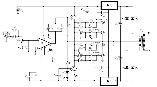 A video distribution amplifier ( VDA ) is types of electronics equipment that takes a video signal as an input, amplifies it, and outputs the amplified video signal to two or more output,
