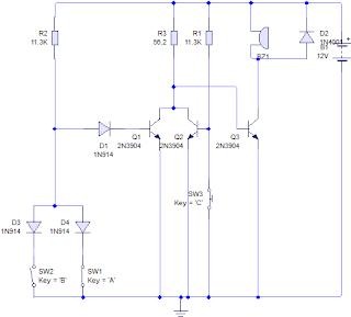 Two switches namely window and door switches are operated in or gate mode Either switch s1or s2 when is closed and the ground switch is closed the alarm will be heard from the sound section. The system is operated by a battery source